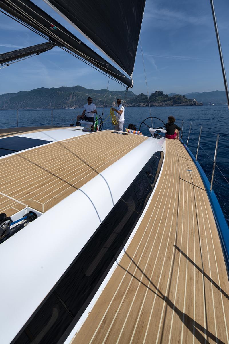 Gli interni sono caratterizzati da un’estetica senza eccessi, con una dinette dotata di numerose aperture e molto spaziosa, che trasmette la sensazione di trovarsi a bordo di una barca di dimensioni superiori a un 50 piedi grazie a una baglio massimo superiore alle sue antagoniste. I volumi, in generale, sono notevoli: merito della sheerline, ovvero della zona prodiera più alta rispetto al resto della coperta, che si nota soprattutto in coperta.
