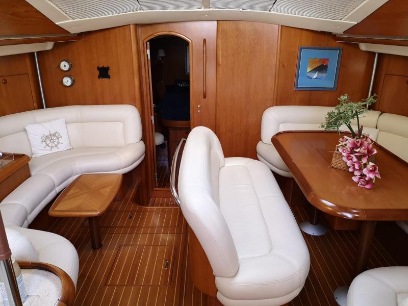 Esistono vari layout (a 3, 4 e 5 cabine); la versatilità degli interni del Sun Odyssey 54 DS è caratterizzata dalla possibilità di disporre di paratie longitudinali amovibili per trasformare le cabine matrimoniali in singole.