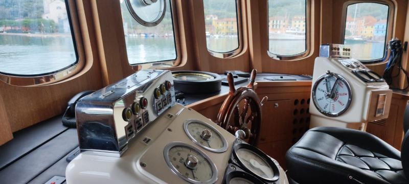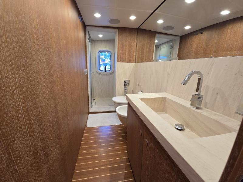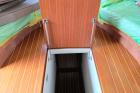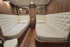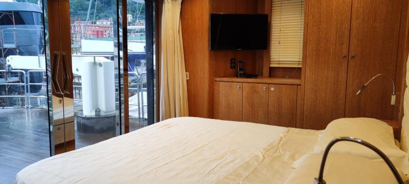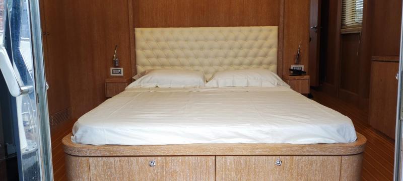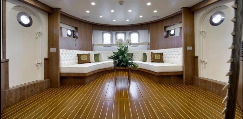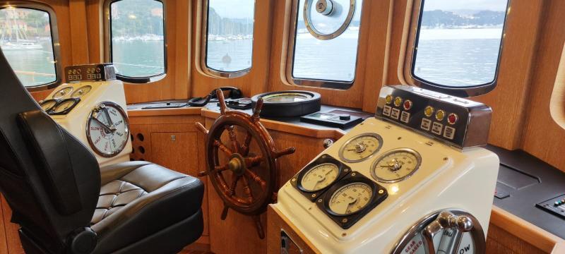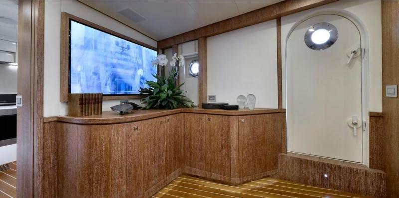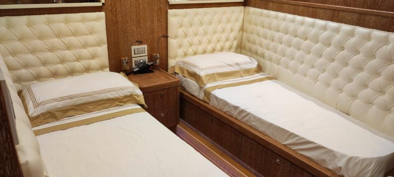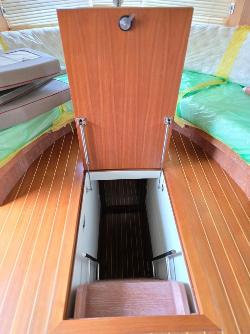 All’interno, il Main Deck accoglie un salottino finestrato, di alta ebanisteria che segue la forma della tuga. Gli ambienti interni sono raccolti, intimi e molto marini. La zona pranzo si trova all’esterno, sul Main Deck. Da un ampio portello a pavimento si accede alla zona notte ospiti attraverso una comoda scala, le cui finiture sono caratterizzate da legno di teak e pelle. Anche la cucina è stata completamente rinnovata, ed è collegata all’esterno attraverso una porta stagna creata appositamente.
