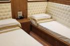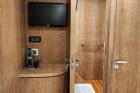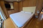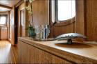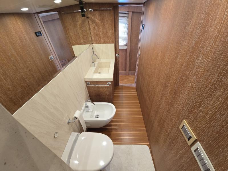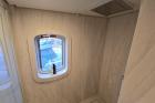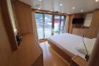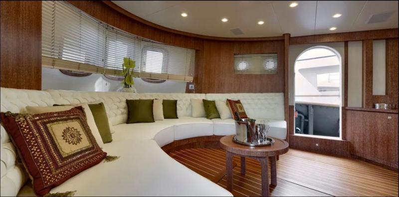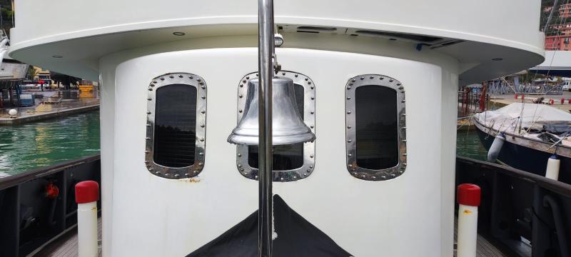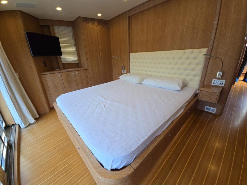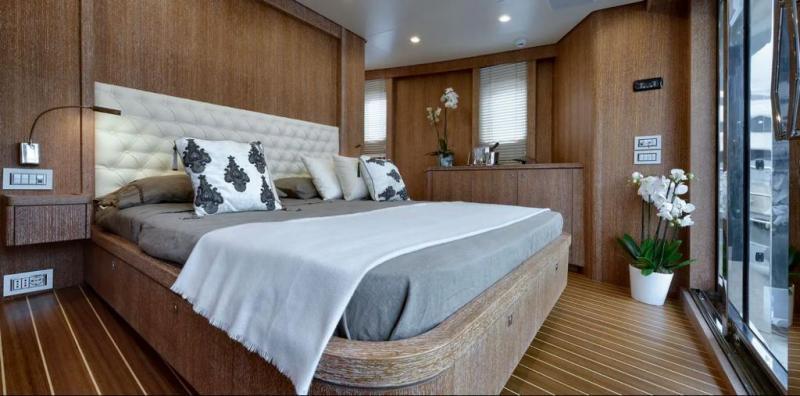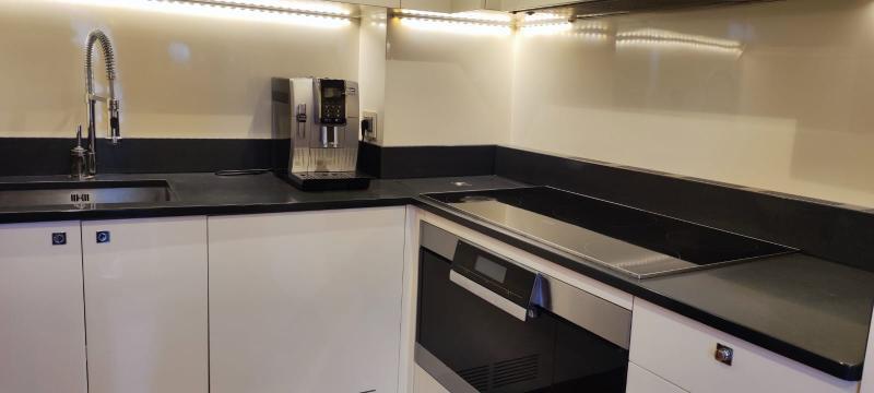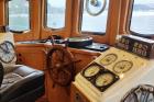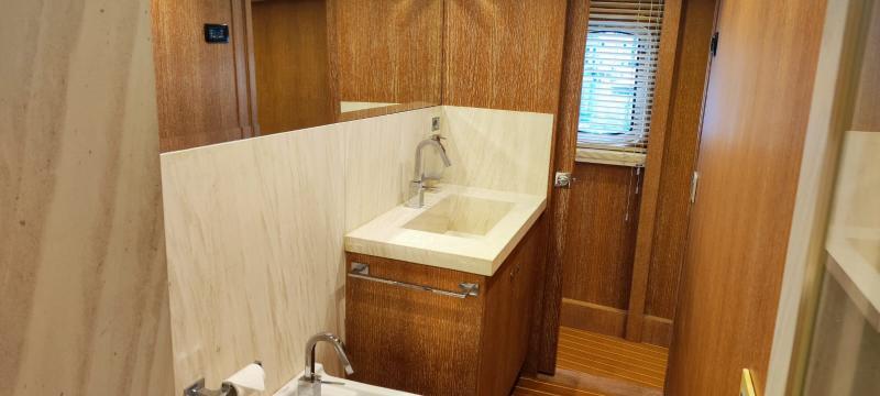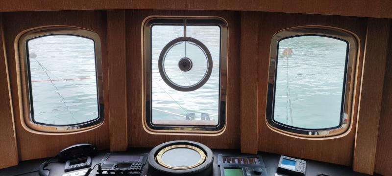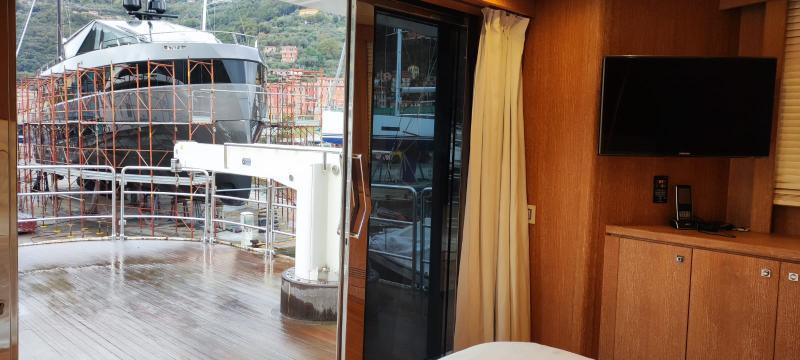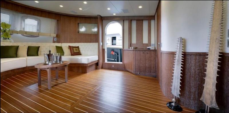 All’interno, il Main Deck accoglie un salottino finestrato, di alta ebanisteria che segue la forma della tuga. Gli ambienti interni sono raccolti, intimi e molto marini. La zona pranzo si trova all’esterno, sul Main Deck. Da un ampio portello a pavimento si accede alla zona notte ospiti attraverso una comoda scala, le cui finiture sono caratterizzate da legno di teak e pelle. Anche la cucina è stata completamente rinnovata, ed è collegata all’esterno attraverso una porta stagna creata appositamente.