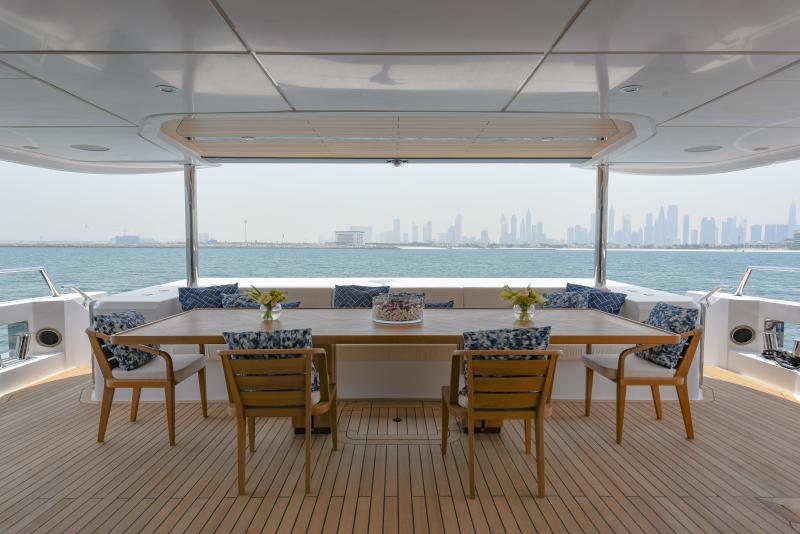 | Accessori | Scaletta per il bagno, Winch tonneggio elettrici, Spiaggetta di poppa idraulica, Gruetta elettrica telescopica per tender, Prendisole sul fly, Postazione comando su fly |