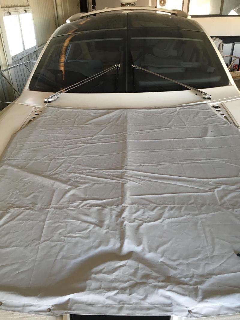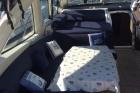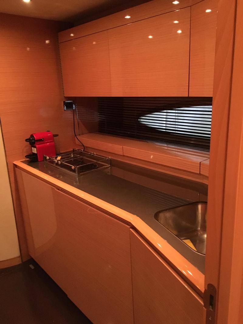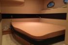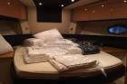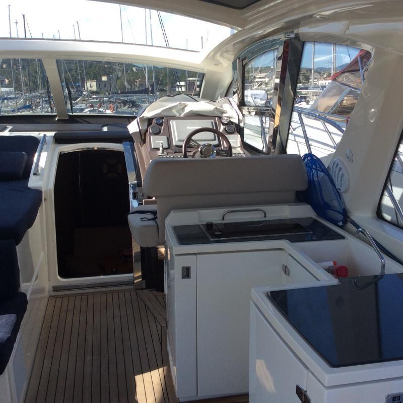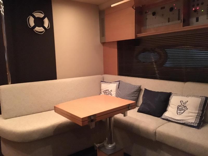 Pozzetto: reso assai godibile dall’impostazione “cabrio”, con tettuccio e finestrature laterali a scorrimento elettrico, l’ambiente è virtualmente diviso in tre aree; a poppa, un comodo prendisole occupa tutta la larghezza disponibile, da sponda a sponda; al centro, sulla sinistra, una dinette a “U” con tavolo regolabile è servita direttamente da un vano cucina attrezzato che si trova sul lato opposto. La zona di guida, a dritta, è comoda e ben dimensionata. Al suo fianco, a sinistra, si trova un piano relax per due persone