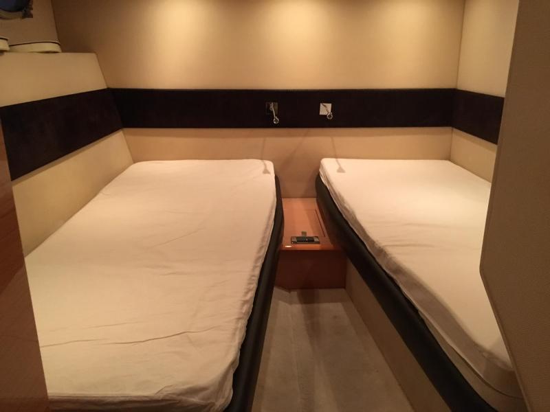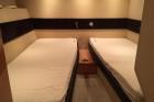 A loro volta, le tre cabine offrono un comfort di tipo più privato, al quale concorrono in modo determinante i notevoli volumi di stivaggio. Se un netto privilegio è assegnato giustamente all’armatoriale, che si trova a prua, non sfigura di certo la cabina di sinistra, a mezzanave, che, grazie al letto matrimoniale e alle dimensioni generali, può essere considerata come una “vip”. L’altra cabina ospiti, di dimensioni leggermente inferiori, è ottima per due ragazzi. In navigazione, il comfort è garantito dalla dolcezza di una carena che, con i suoi 16 gradi di stellatura allo specchio, passa sull’onda senza mai battere e segue l’accostata con un rollio indotto che facilita l’equilibrio dei passeggeri.
