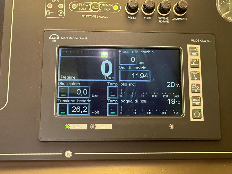 | Strumentazione | VHF, Ecoscandaglio, Log, Radar, Bussola, Distress, Display Multifunzione, Angolo di barra |