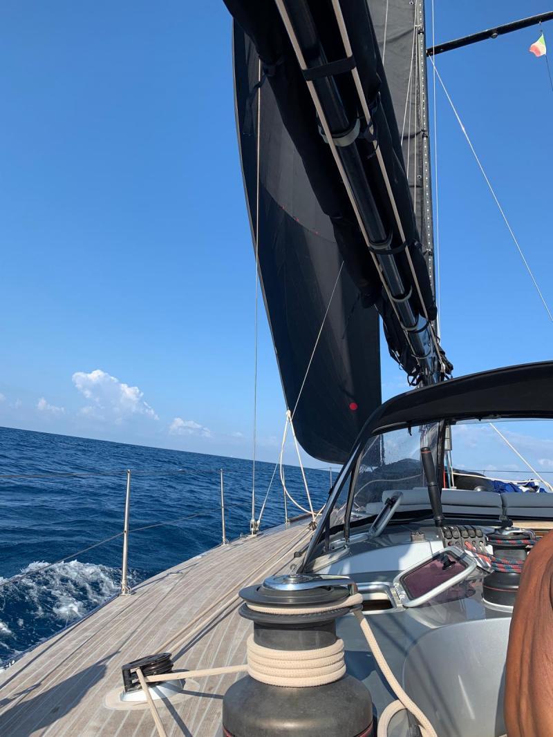 PIANO VELICO: rispetto al progetto originale, che prevede un triangolo di prua con sovrapposizione, l’esemplare della prova disponeva di solo piano velico crocieristico, con lande a murata e di conseguenza fiocco al 100%. Una scelta che, togliendo circa 25 mq di tela, penalizza le prestazioni con le ariette e preclude quelle prerogative sportive insite net progetto. In fondo, per facilitarsi le manovre nulla toglie di montare un genoa senza sovrapposizione anche con le lande interne. L’armo è frazionato a 9/10 con tre ordini di crocette acquartierate senza volanti né stralletto.