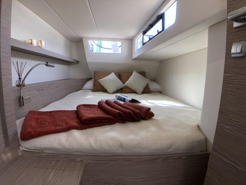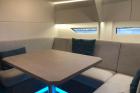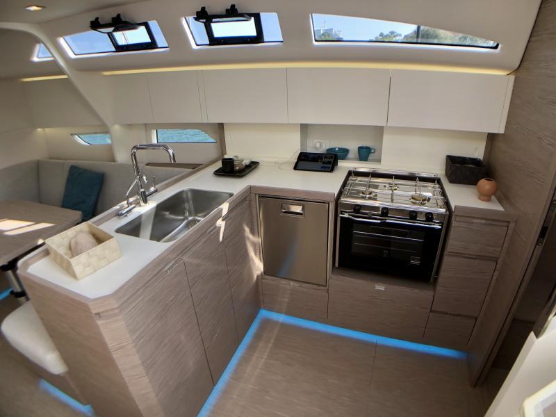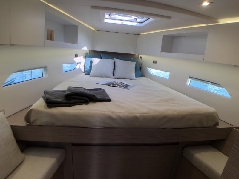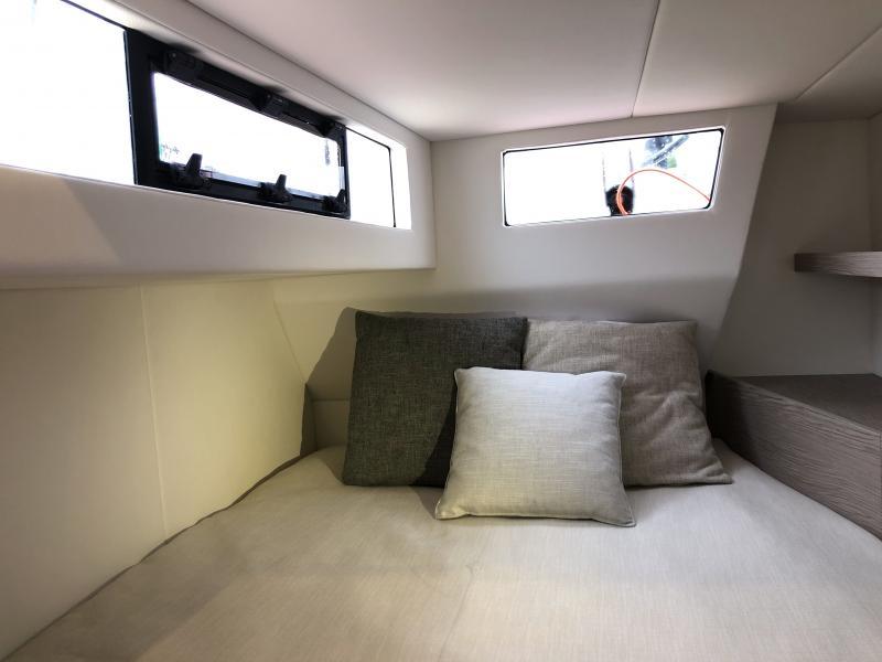 Non mancano le soluzioni originali, dalla linea del ponte con una leggera onda che ricorda quella già vista su The Fifty, alla soluzione studiata per le cabine di poppa che godono della luce naturale offerta dalla finestratura continua ricavata dalle panche del pozzetto.