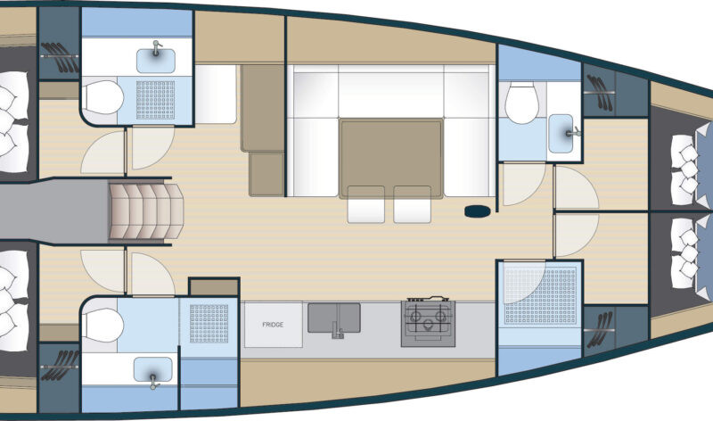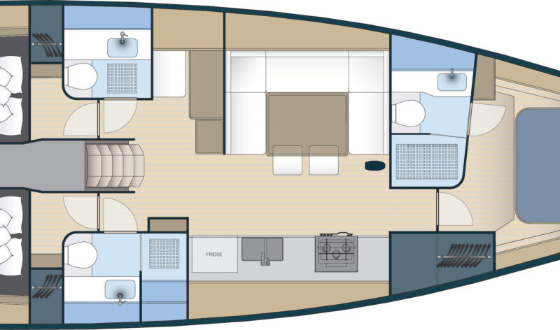 Il 50 è disponibile anche con due diversi layout interni con 3 cabine o 4 cabine entrambe con cala vele di prua.