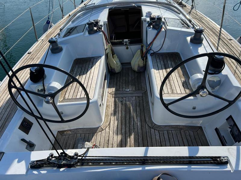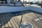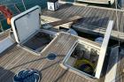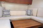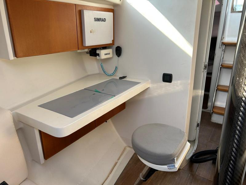 Anche il teak della coperta è di qualità, recessato nella vetroresina e quindi a filo con le superfici adiacenti. Al pari del design esterno, anche gli interni appaiono avveniristici. Sottocoperta, il design minimalista e funzionale della dinette viene esaltato dalla grande luminosità degli interni proveniente dalle due ampie finestrature laterali con un ampia dinette, zona carteggio, ampio bagno separato e due cabine di poppa speculari con ampi armadi.