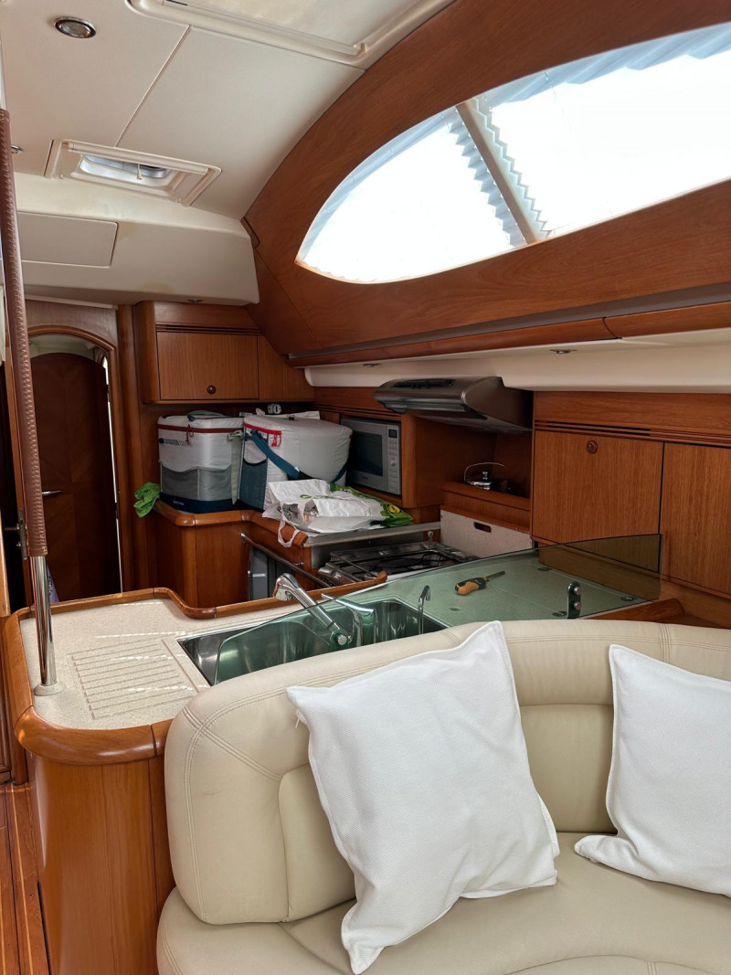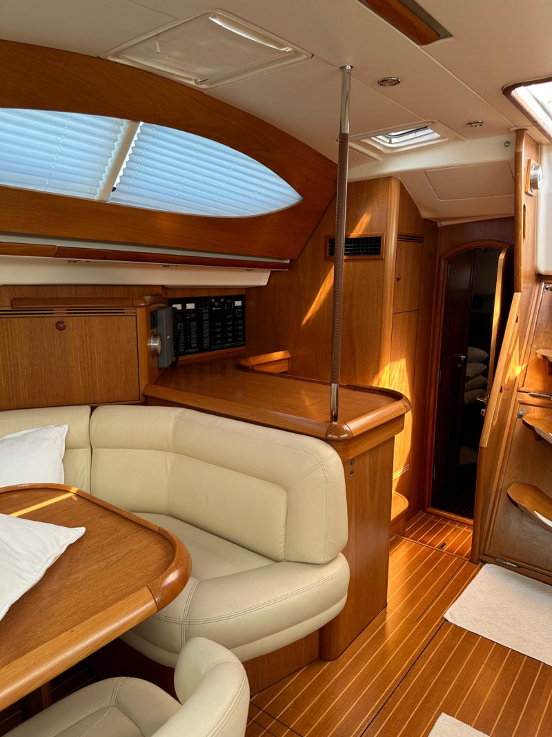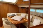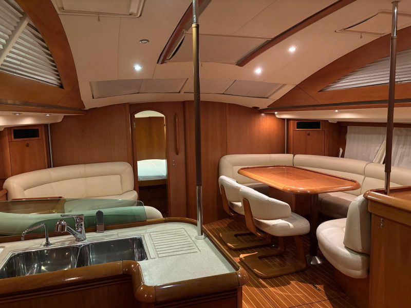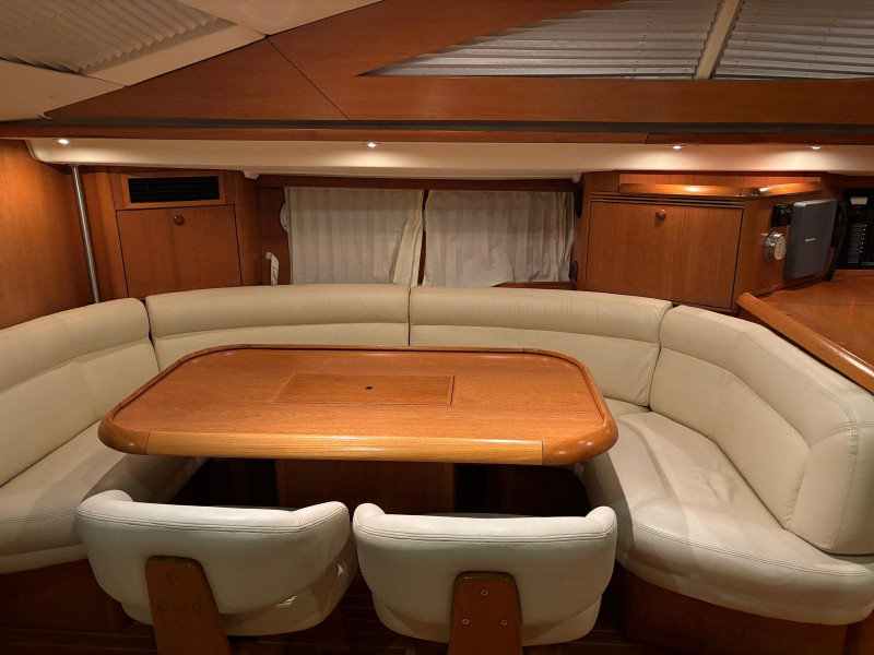 Gli interni del Sun Odyssey 54 DS, realizzati in legni pregiati, mettono ulteriormente in risalto il comfort e la versatilità di questo modello; il quadrato è disposto su due livelli, con dinette su piano rialzato a cucina a L sulla murata di sinistra, a un piano leggermente inferiore accessibile scendendo un gradino.