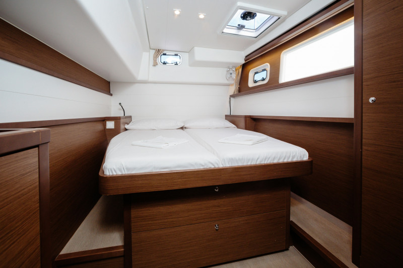 Quest’ultimo, così come la zona pranzo sulla sinistra sono situati dietro una grande cambusa a forma di U nel salone principale, dotata di una finestra scorrevole appositamente progettata dietro il lavandino. In realtà, aprendo anche le porte scorrevoli del pozzetto, non c’è praticamente nessuna separazione tra il salone interno e la zona giorno esterna. Gli interni sono invece contraddistinti da legni e finimenti dai colori chiari.