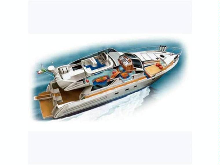Lay-out and main features: forward owner cabin with double bed, two wardrobes, settees, en-suite bathroom with separated shower; two guest cabins with twin beds and wardrobe; guest bathroom with separated shower; main saloon with two dinettes, wet-bar, steering station and separated galley with access to the starboard side; crew cabin with bed, wardrobe and bathroom.